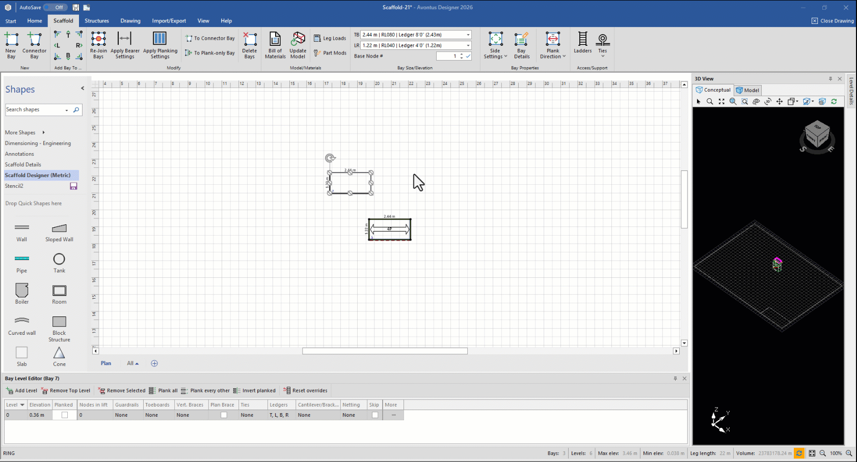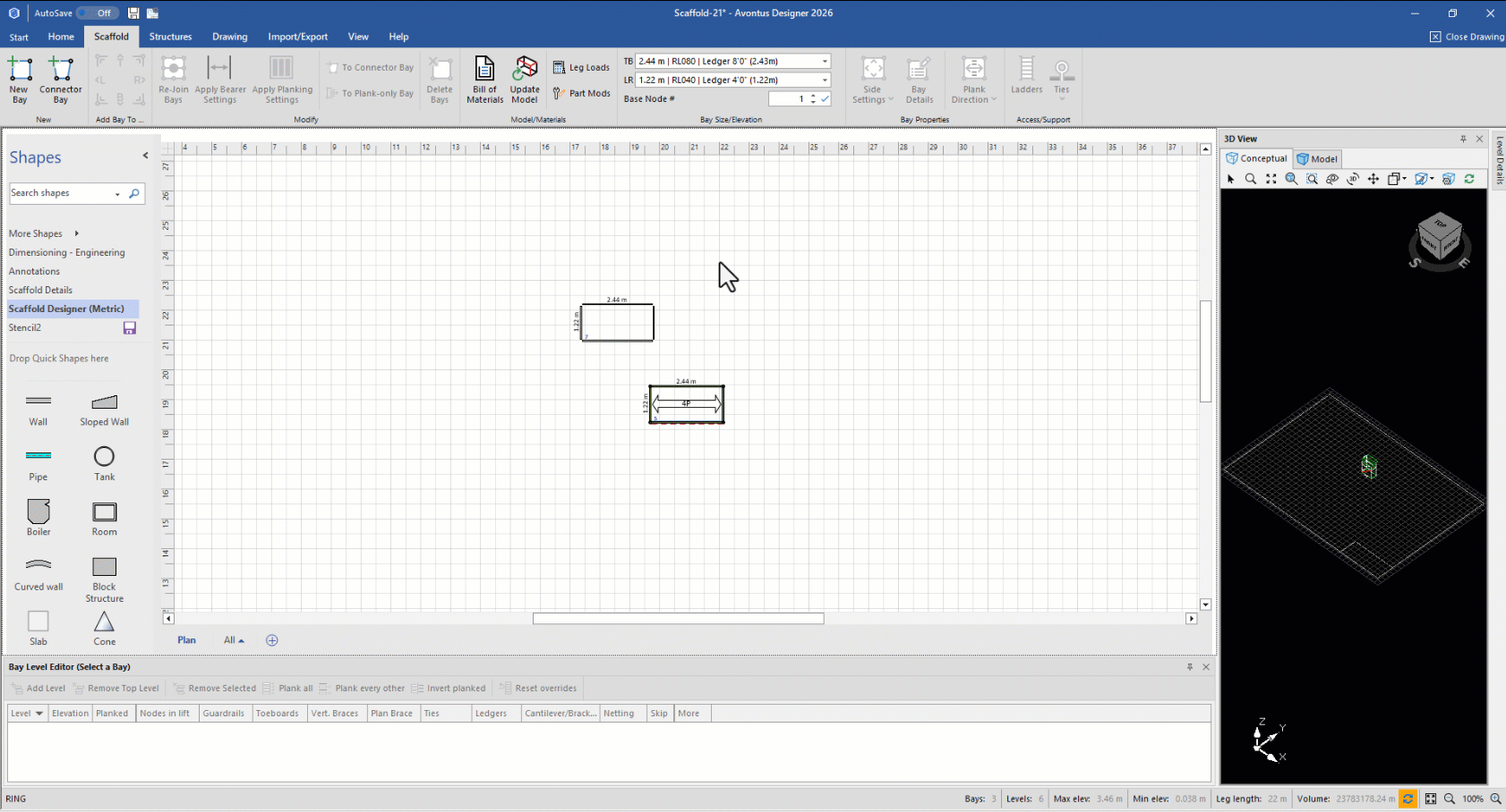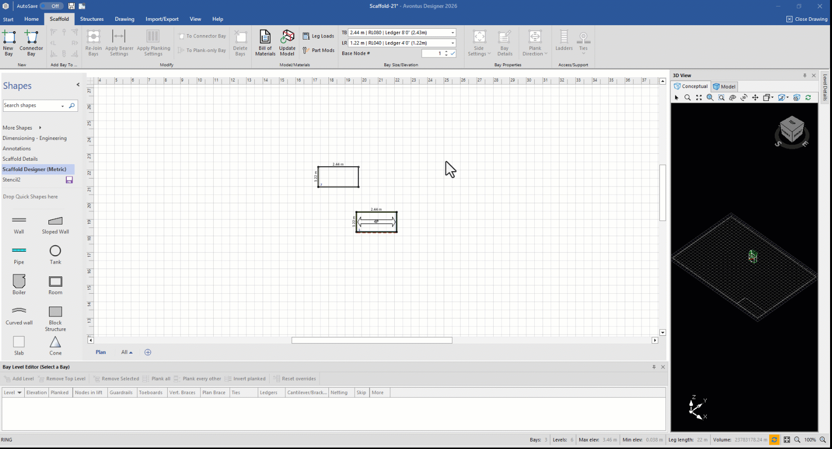 Avontus Designer enables you to isolate virtually any part of a Scaffold and combine parts from different Scaffolds in interesting ways to achieve custom designs. For example, a Scaffold may need diagonal bracing along with extra horizontal ledgers for strength. To do this, you will create a regular Bay with a second, ledgers-only Bay located mid-standard.