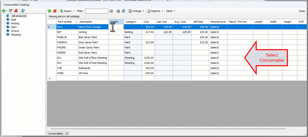 The Consumable Catalog appears.Click the item you want to move, then click the Change dropdown and select Move Selected Items to Product Catalog