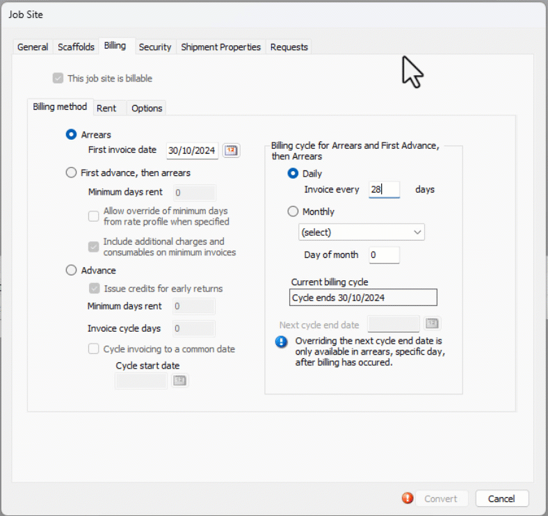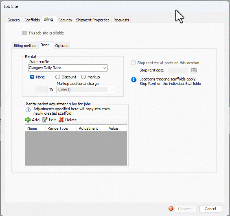 The conversion of a Scaffold Tag Job Site to Billable CANNOT be reversed. Once you convert the Scaffold Tag Job Site, select settings and information related to the Job Site or Shipments may become locked and disabled for editing. It is very important to verify the information in Quantify carefully and complete all data preparation before completing the conversion.
