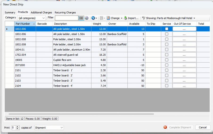 When all parts have been scanned, complete the Additional Charges and Recurring Charges tabs, or click Complete Shipment.