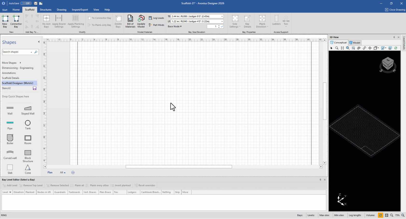 On the drawing page, a Boiler is a square or rectangular shape within which Avontus Designer can add Scaffolding that you define. If necessary, you can add a Boiler without Scaffolding.